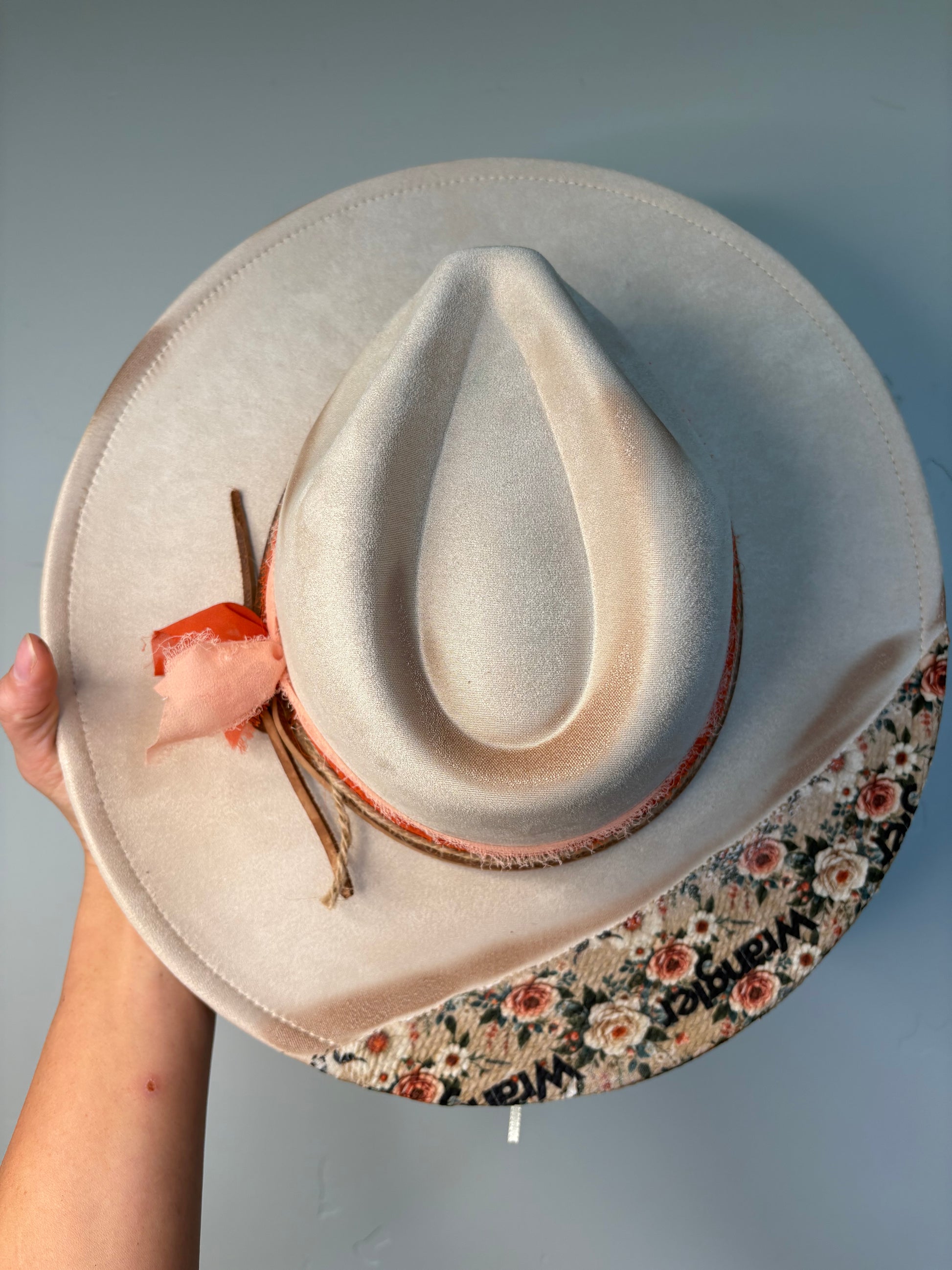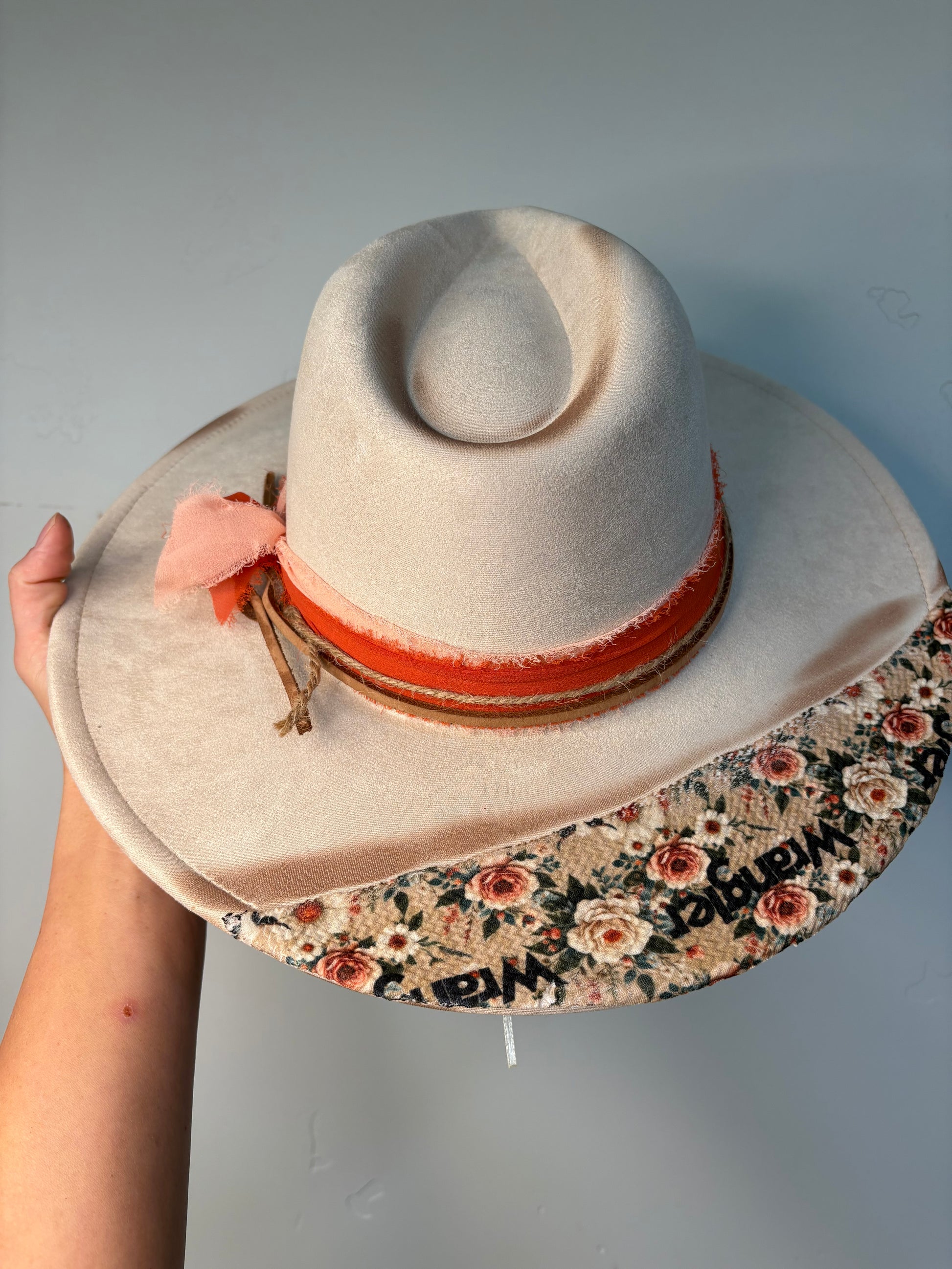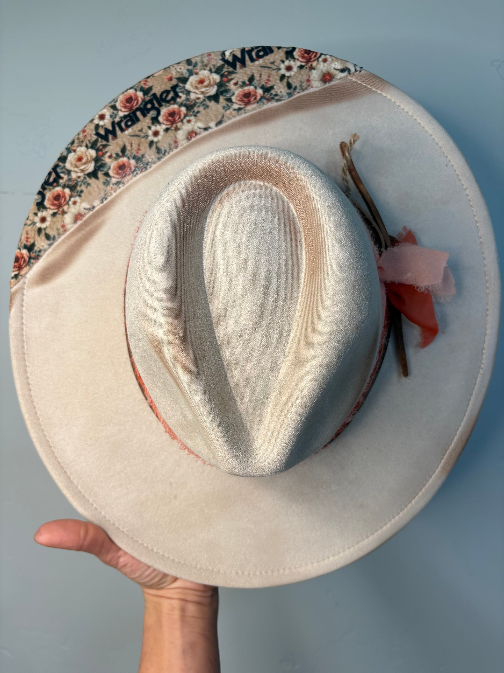 This custom hat features a beige polyester suede material paired with a warm, neutral orange band for a subtle pop of color. The backside of the brim is finished with authentic Wrangler material, adding a rugged yet stylish touch that blends western heritage with modern design. A versatile piece, this hat is made to stand out while keeping a timeless, classic appeal.