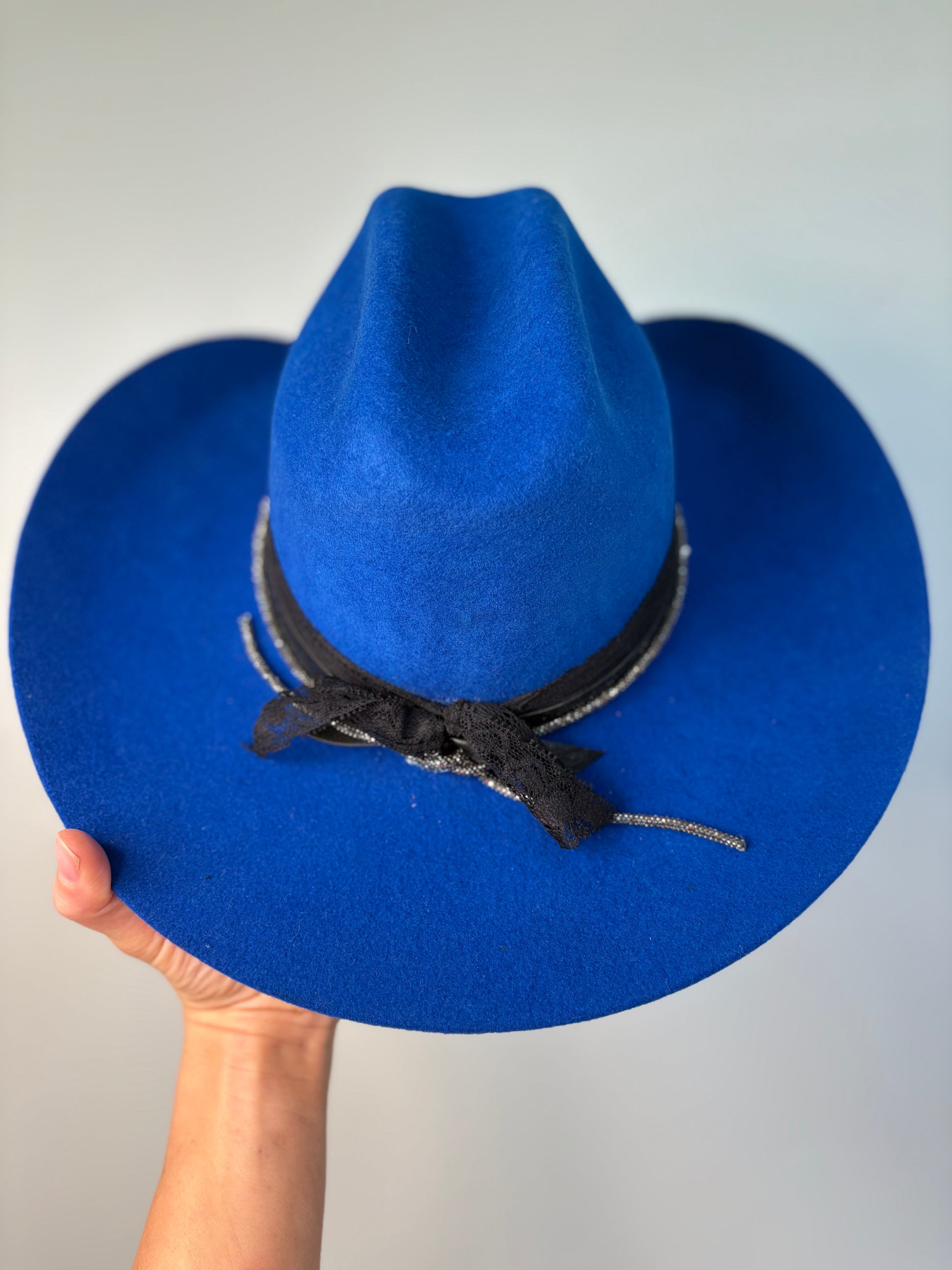 This royal blue custom cowboy hat is a true statement piece — bold yet timeless. Crafted from 100% wool felt in size 7 1/8, it features a sleek black custom band accented with a rhinestone rope for just the right touch of sparkle and flair. Simple, stylish, and perfectly balanced, this hat is made to stand out with elegance and confidence.