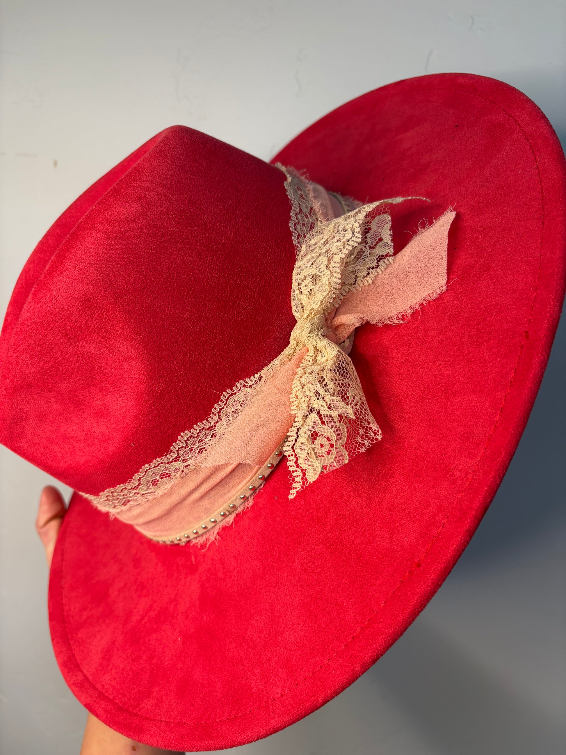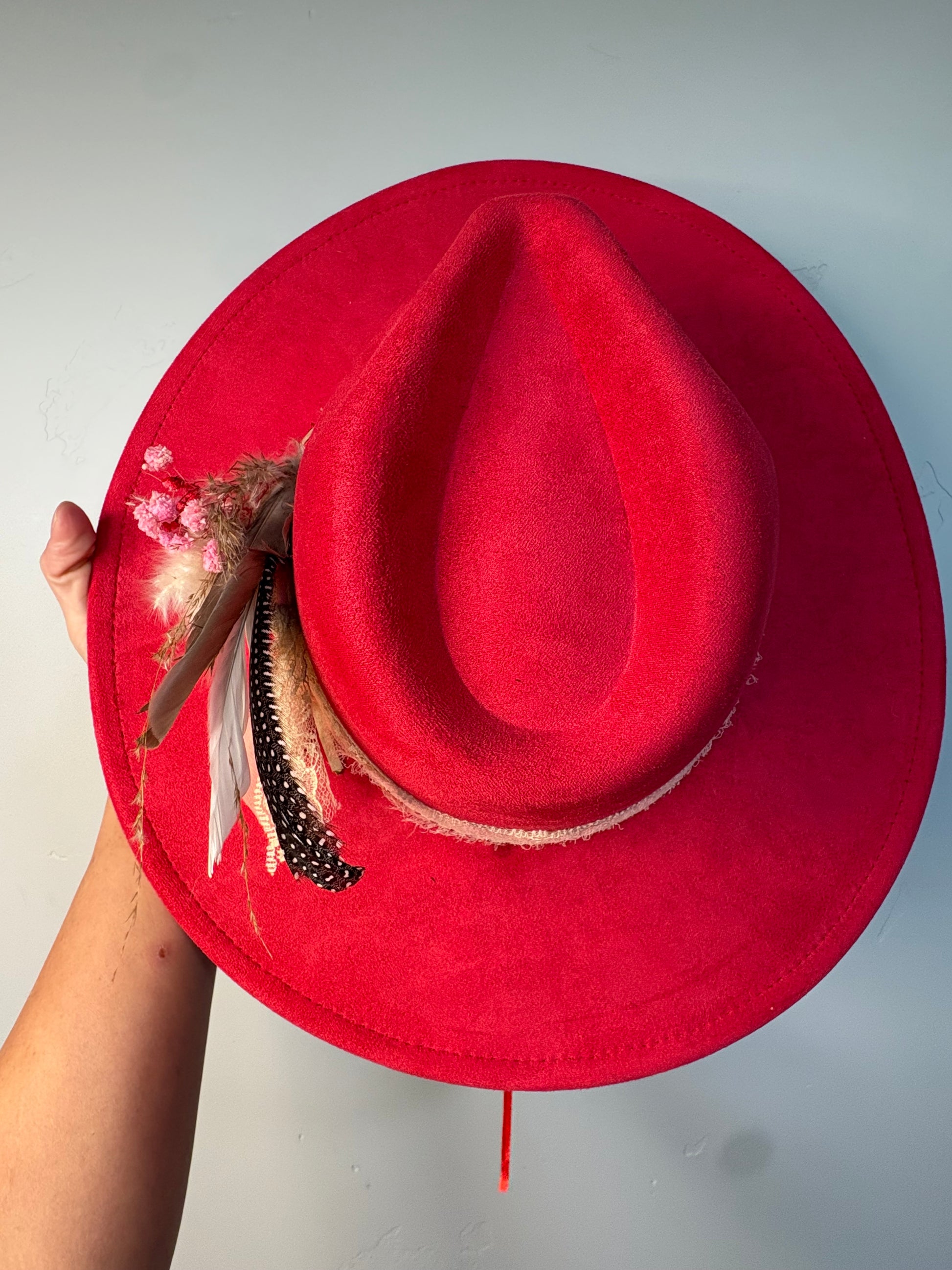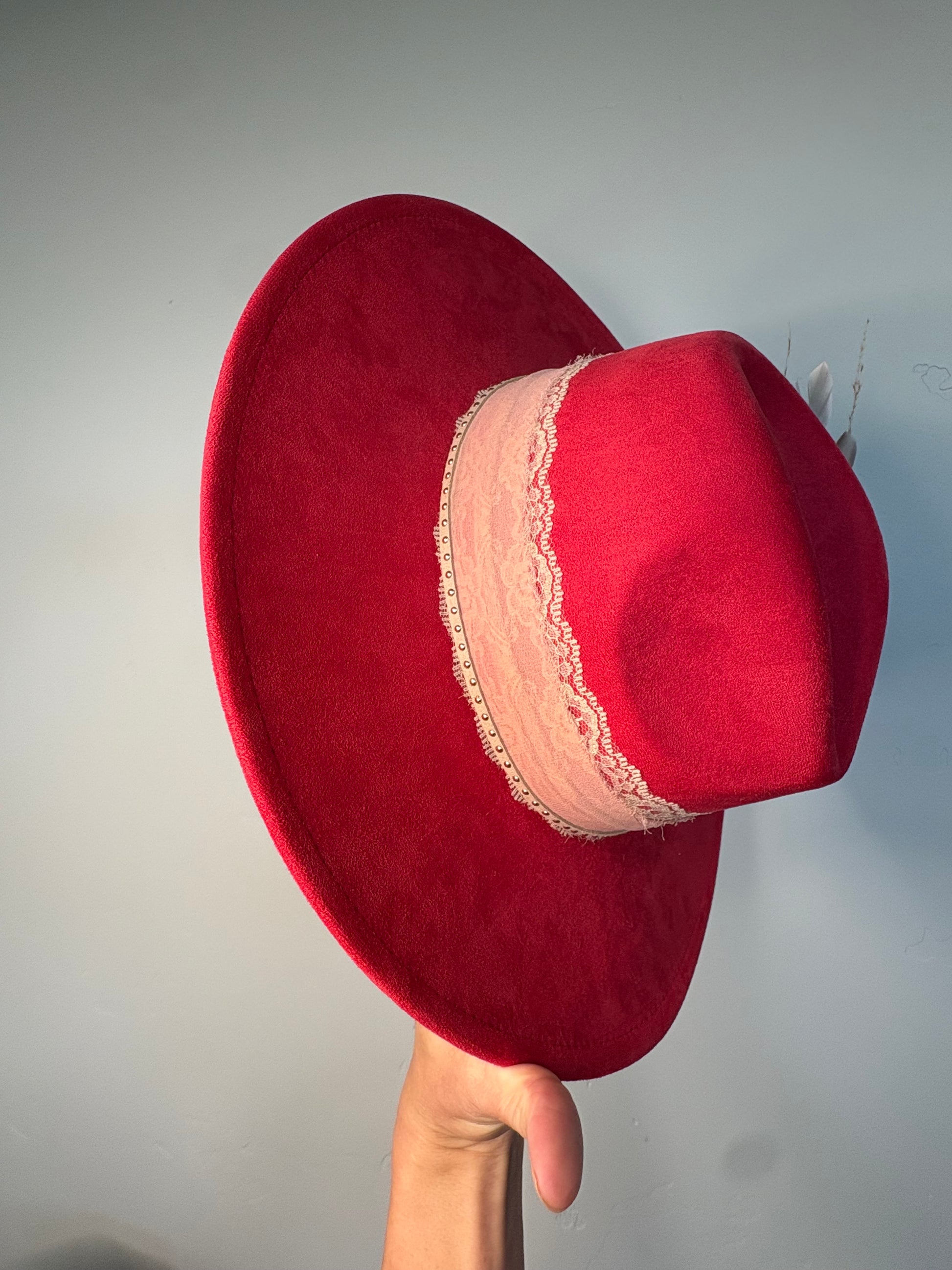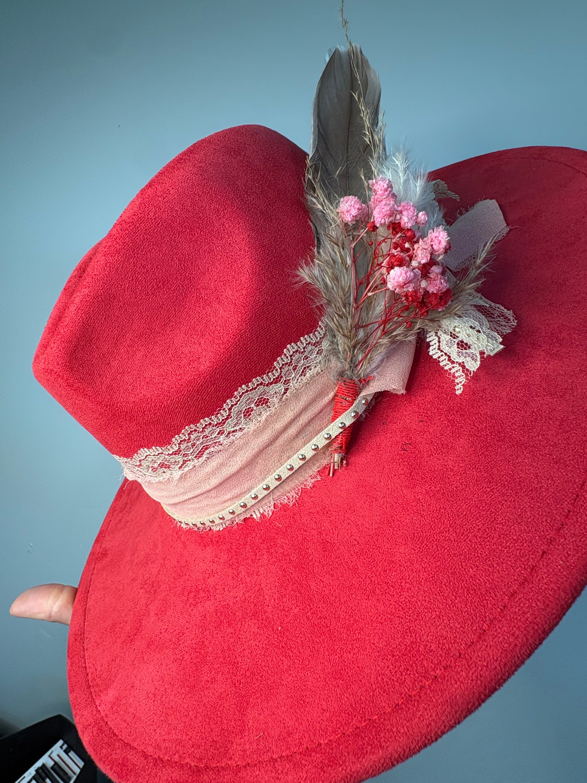 This vibrant fuchsia pink-red custom hat is crafted from soft polyester suede, combining bold color with elegant design. It features a neutral-colored band and delicate lace detailing for a touch of sophistication. A beautiful, removable flower bundle adds versatility and charm, allowing you to customize your look. With adjustable sizing, this hat offers both comfort and style, perfect for making a statement at any occasion.