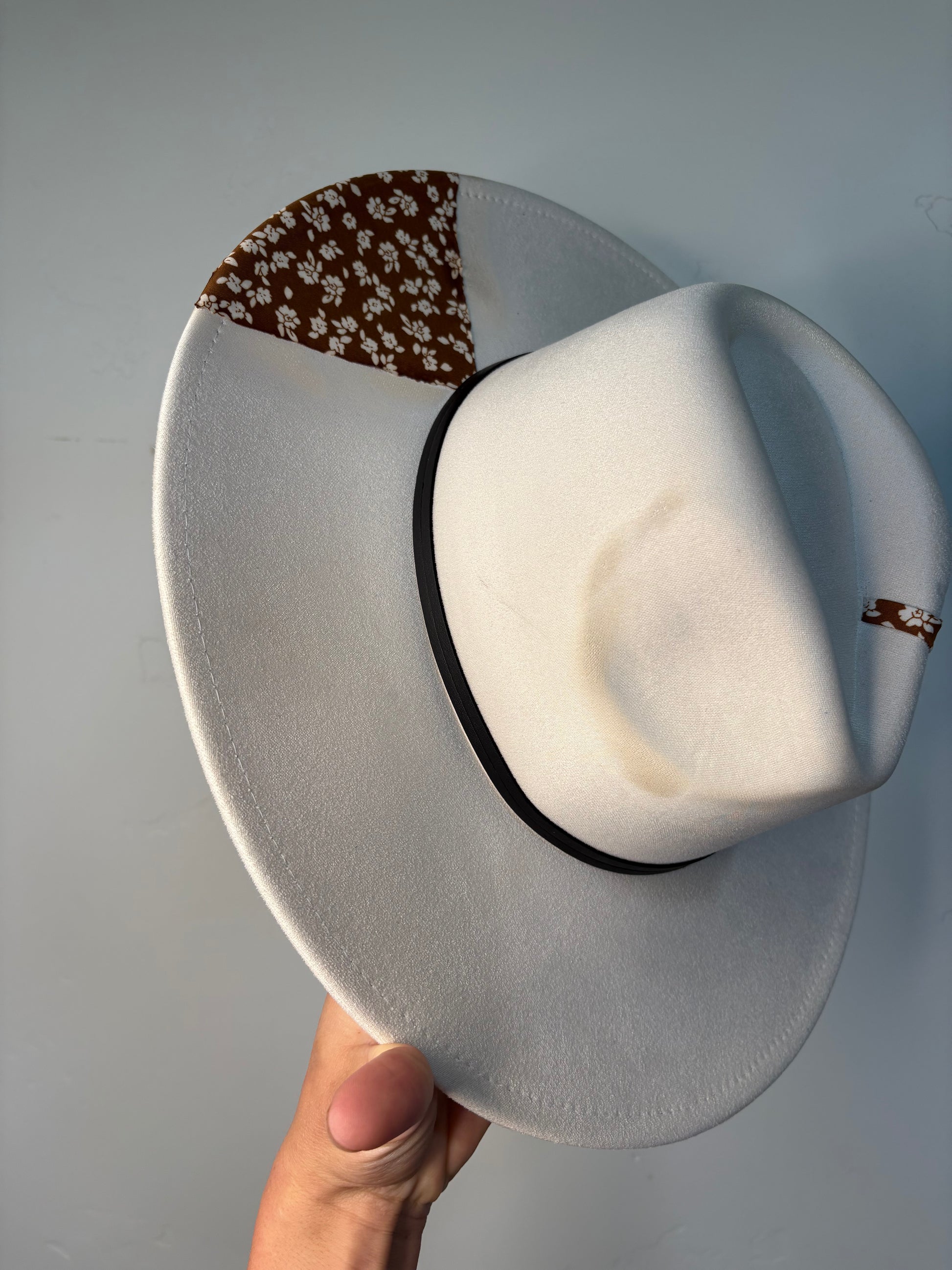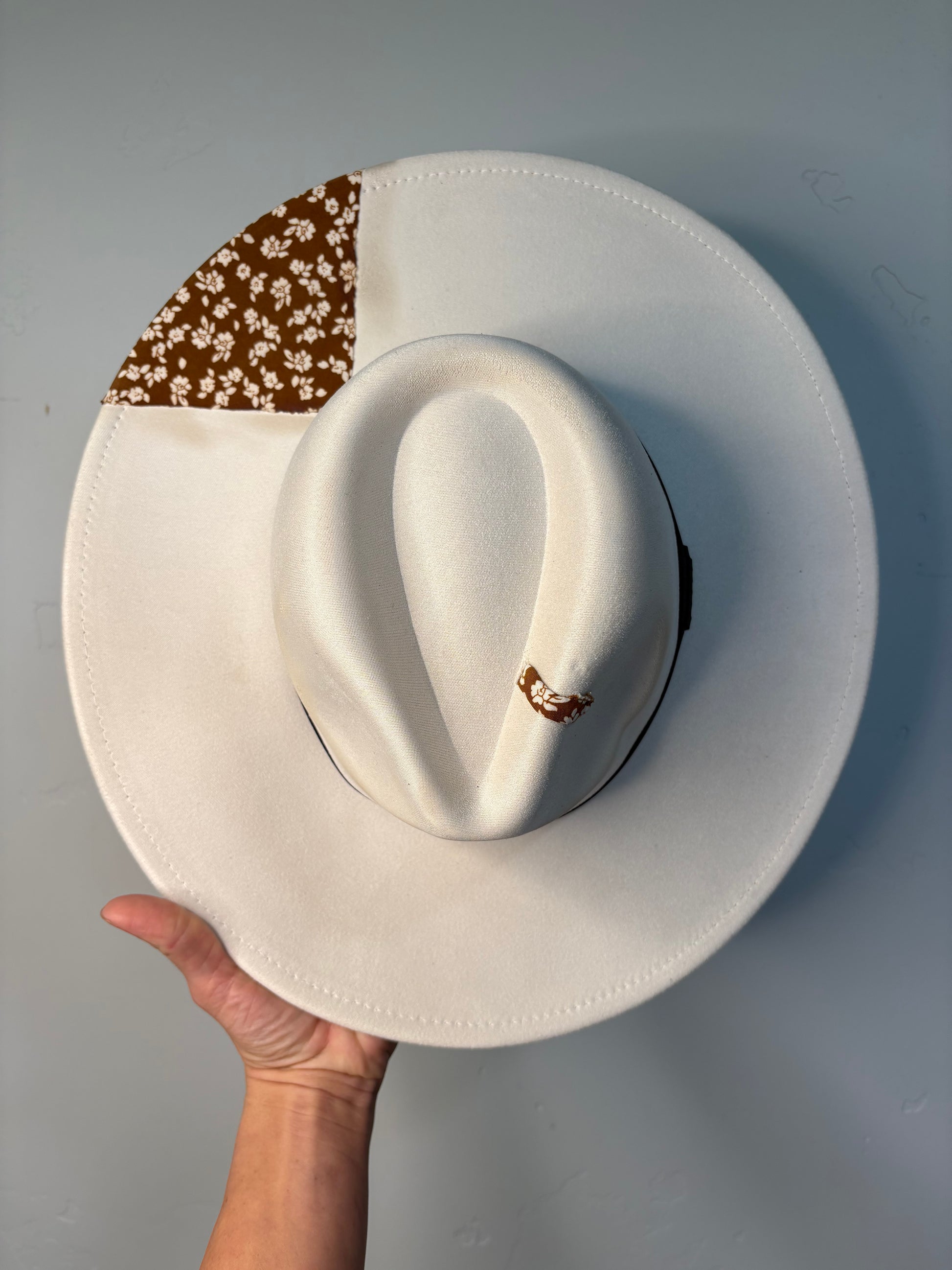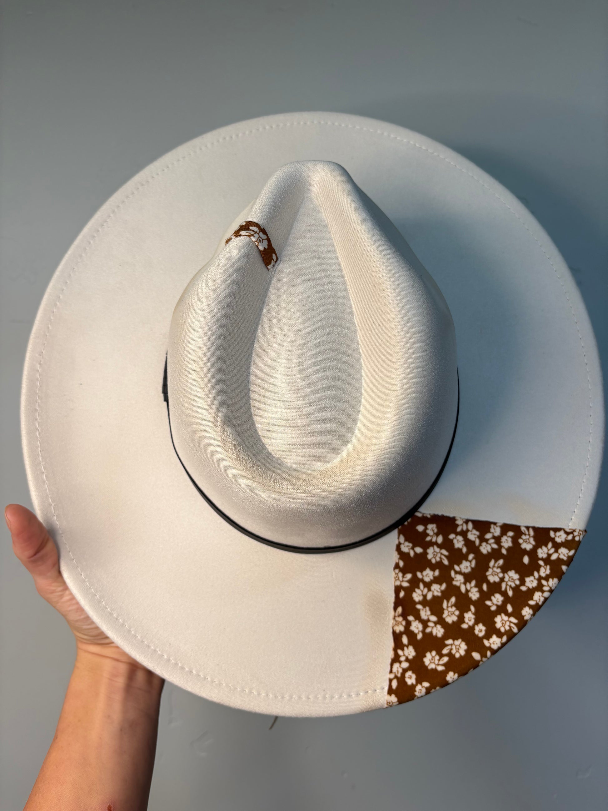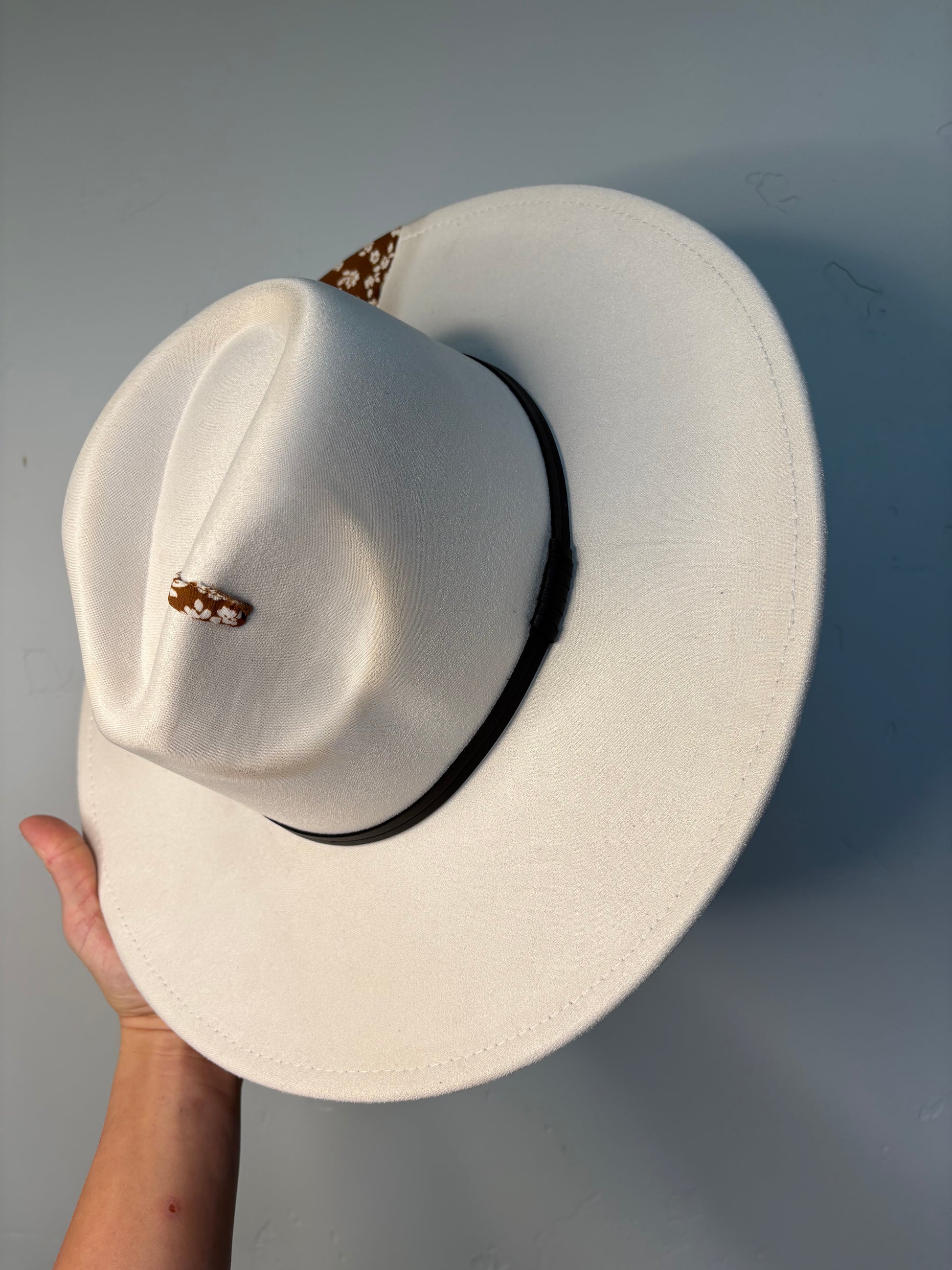 This custom white suede hat brings a fresh, modern twist to Western tradition. Its clean crown is accented with a subtle rust brown-and-white floral fabric inlay along the brim and a matching detail stitched at the crease, creating a perfect balance of minimalism and charm. The crisp black hatband adds definition, while the patterned accents infuse a touch of personality and rustic flair. A versatile piece, it pairs effortlessly with both classic denim and dressy western wear.
