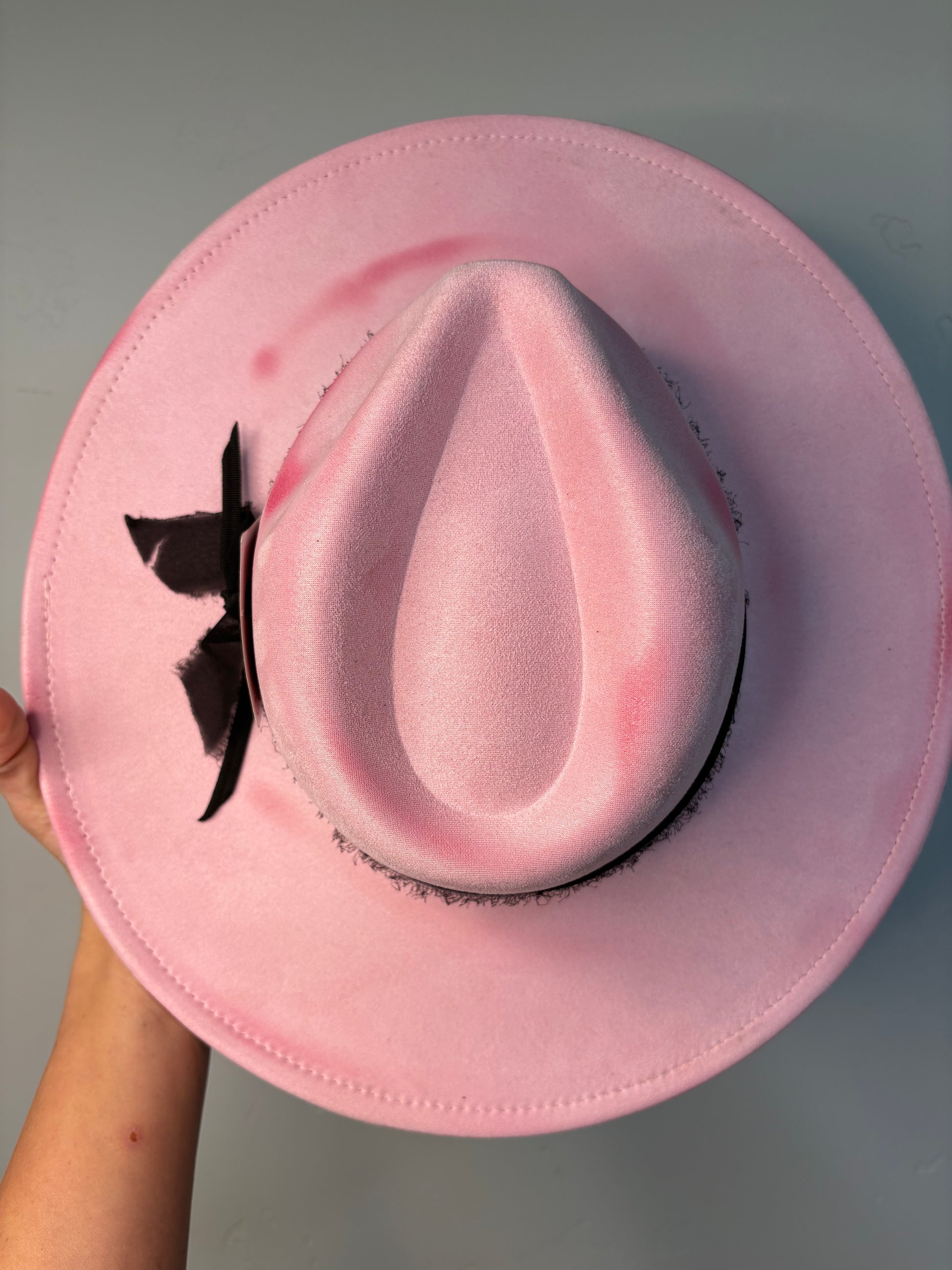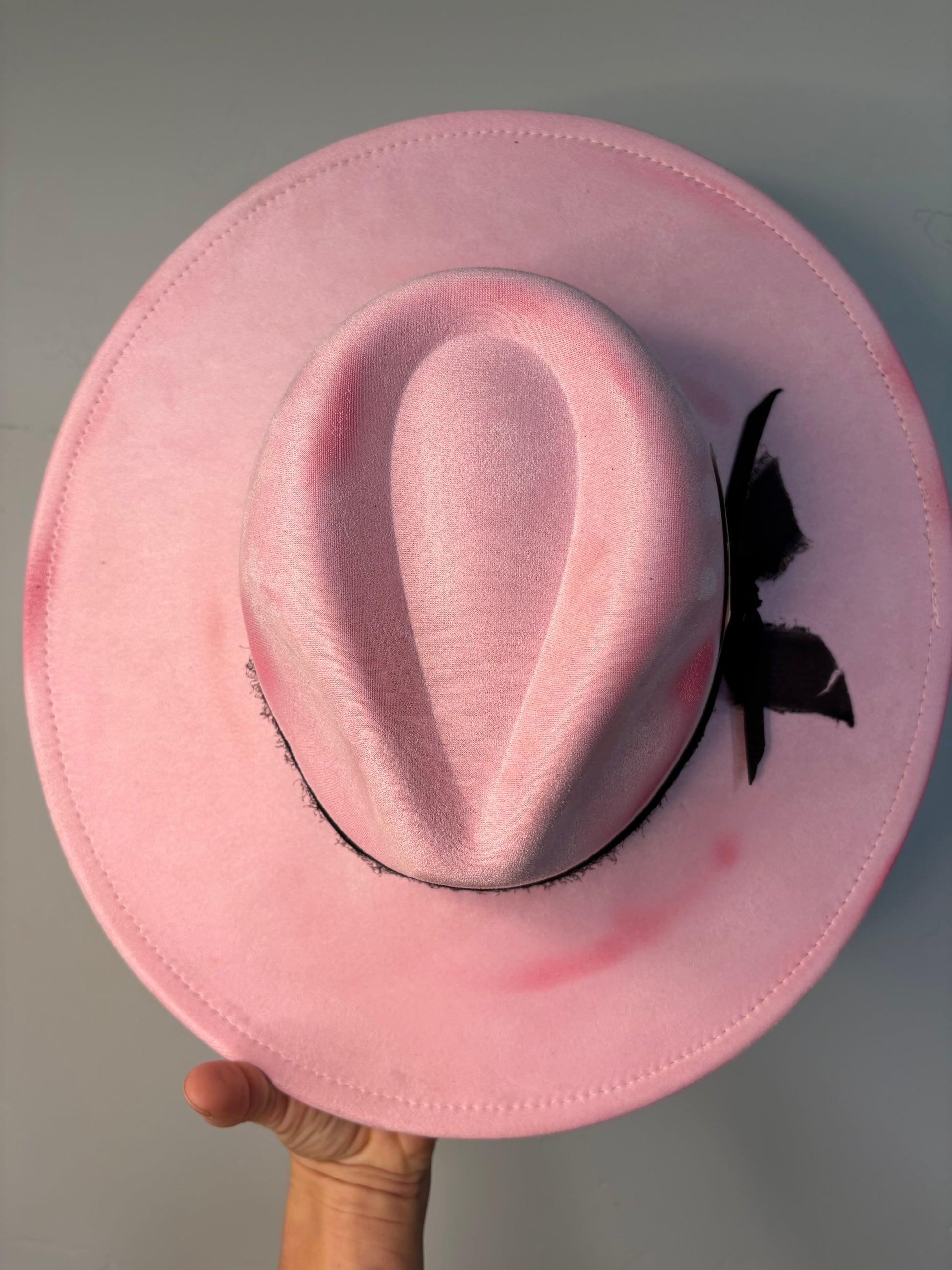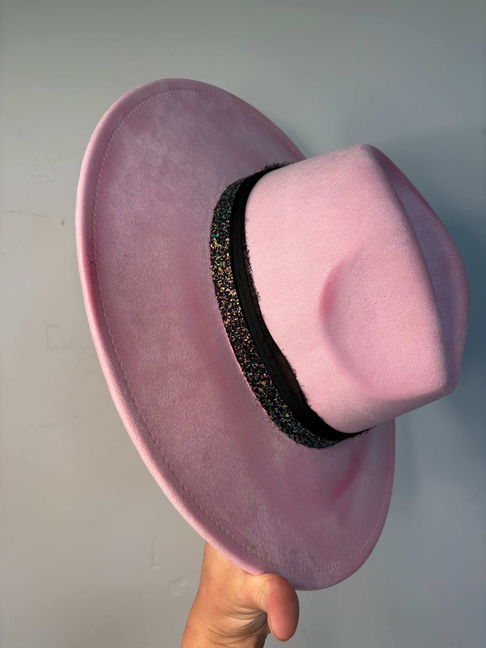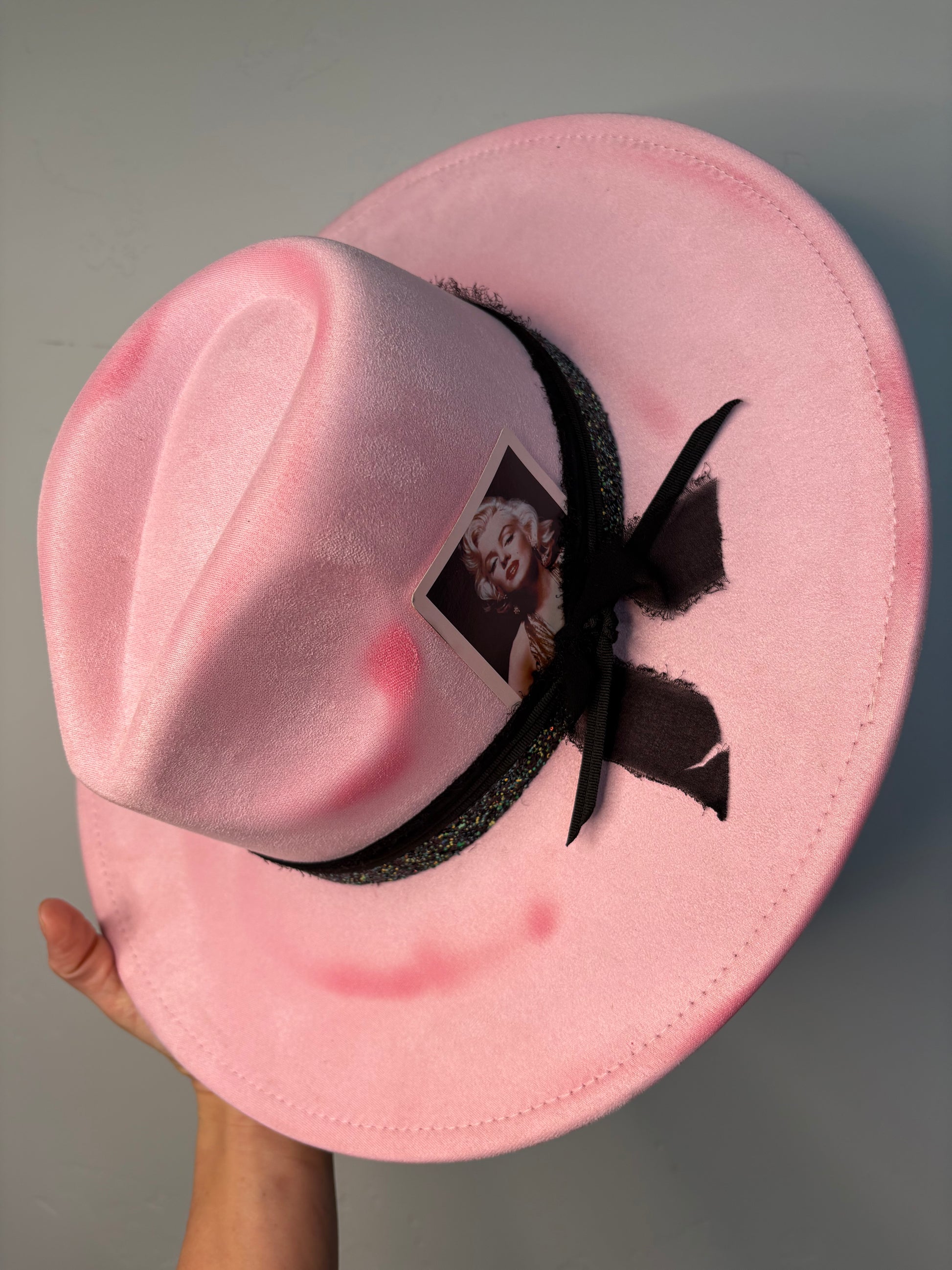 The Hollywood Rose is a dusty pink hat made from durable polyester suede material. It features a sparkly black custom band with a special Marilyn Monroe card attached, adding a touch of glamour. The burnt hues also add texture to this stylish hat while the adjustable sizing ensures a comfortable fit.