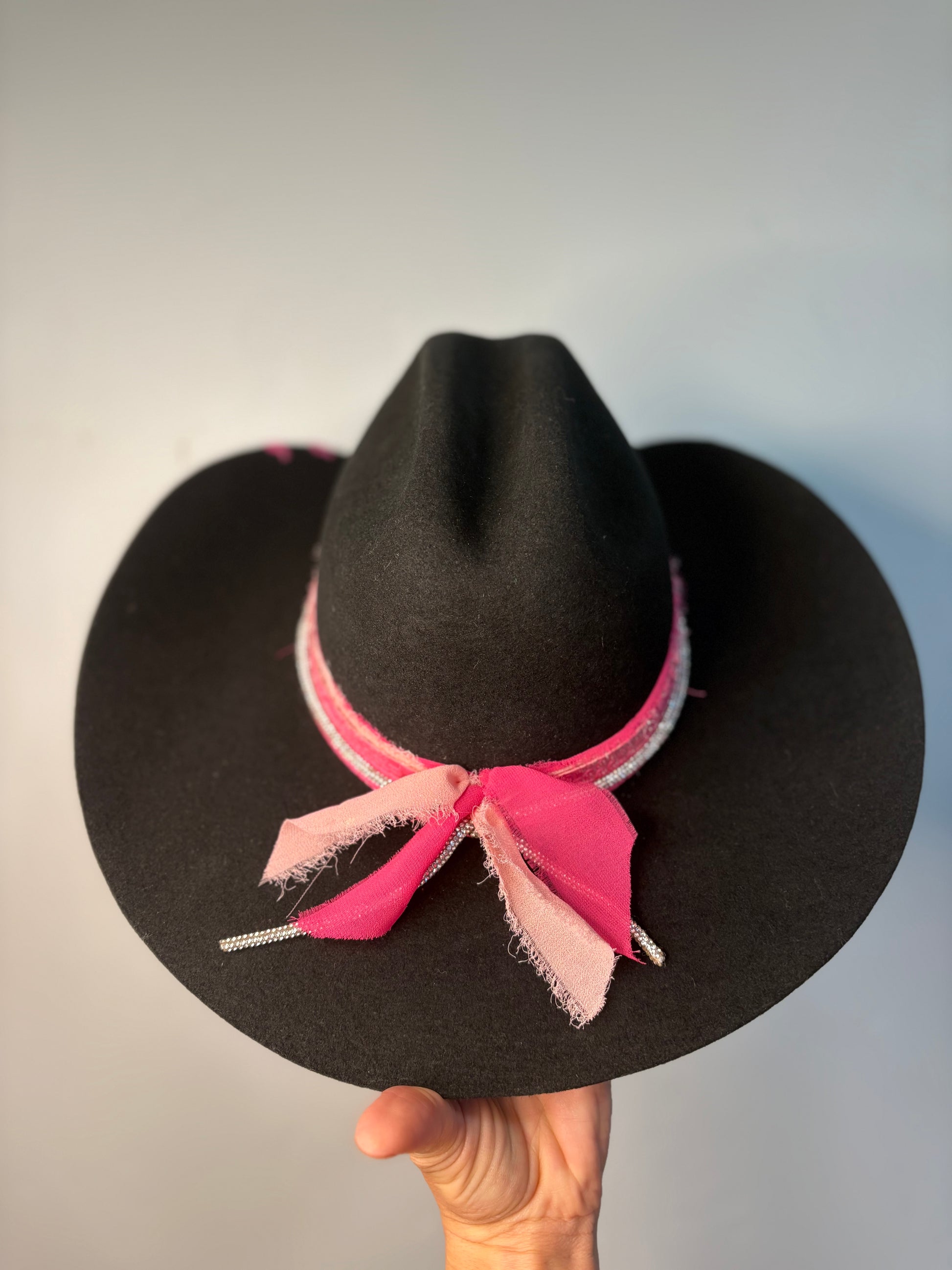 This striking black cowboy hat is crafted from 100% wool felt in a Cody James size 6 7/8, combining classic Western style with bold accents. It features a hot pink alligator band, a delicate light pink ribbon, and a sparkling rhinestone rope, creating a standout look that blends rugged craftsmanship with feminine flair. Perfect for making a statement while keeping traditional cowboy hat quality and comfort