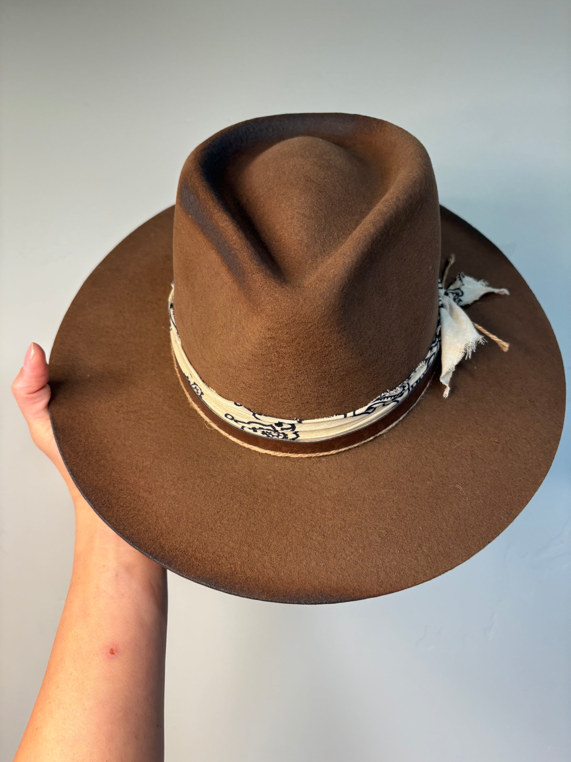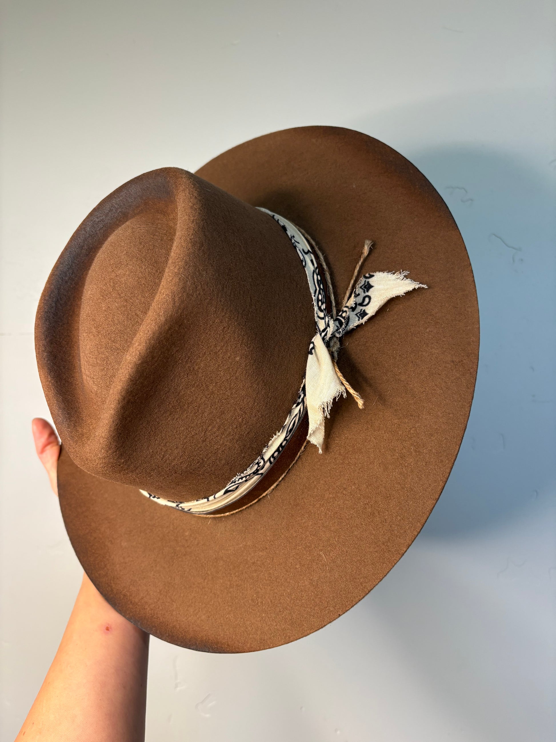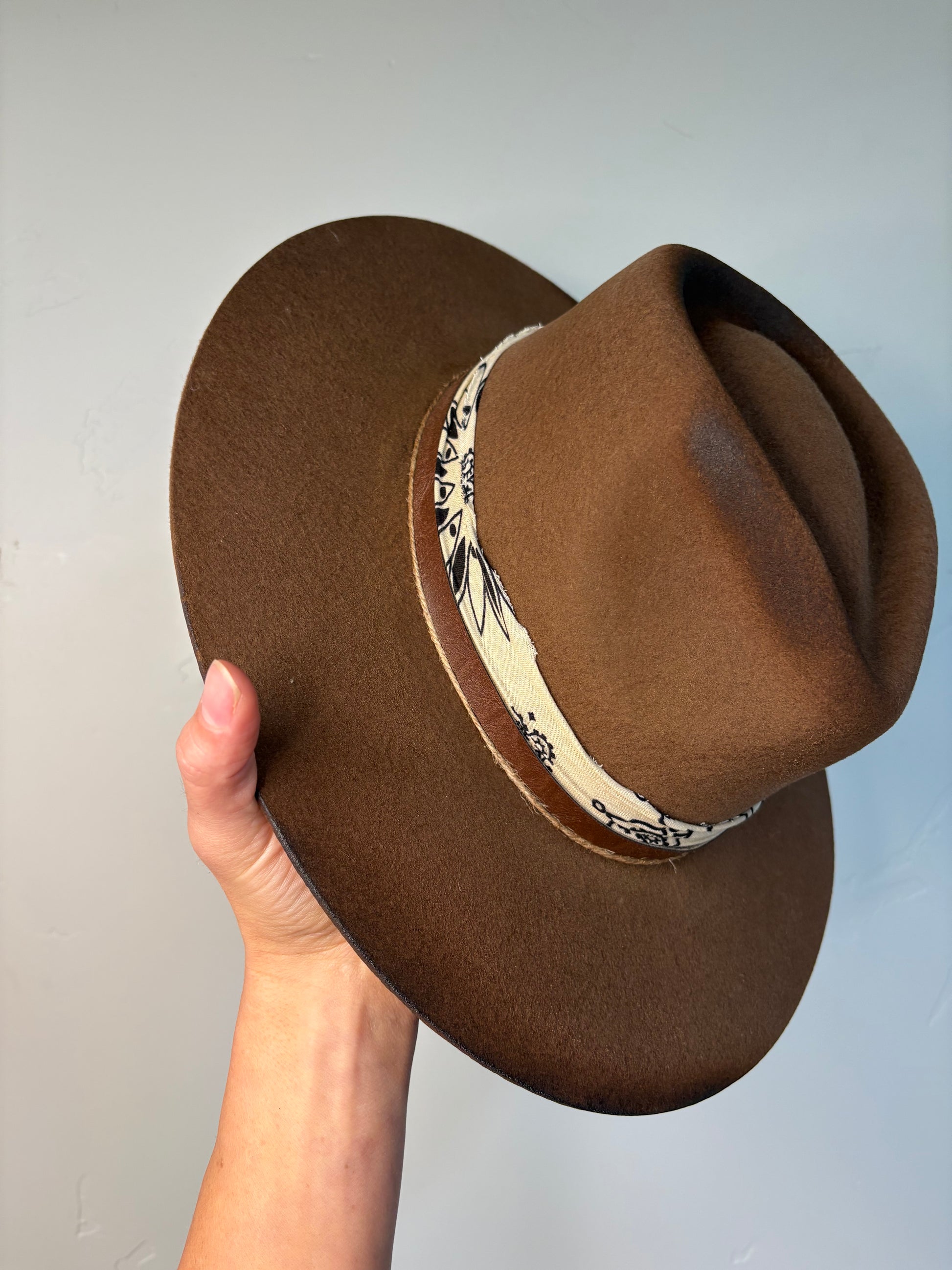 This unique Brown wool fedora hat includes a custom band with a bandana and brown band, making it a fashionable accessory. Its adjustable sizing accommodates a wide range of sizes, making it suitable for both men and women. This hat is versatile and perfect for dressing up any outfit while providing a comfortable fit.