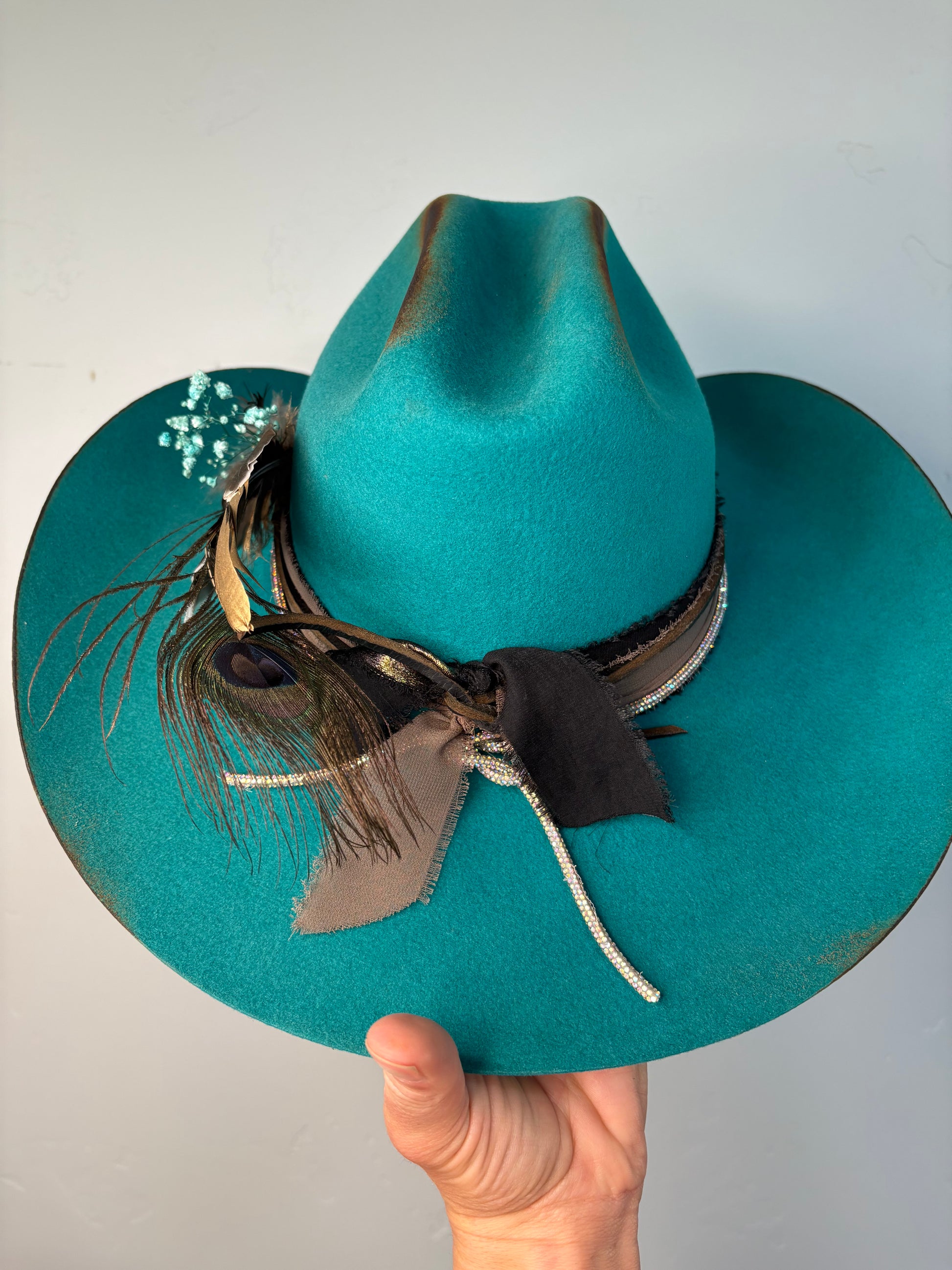 This Turquoise Western hat showcases a unique band in neutral colors and a sparkling rhinestone rope, complemented by a stunning feather bundle. It comes in size 7 1/8 (57cm) and is an essential accessory for any wardrobe.