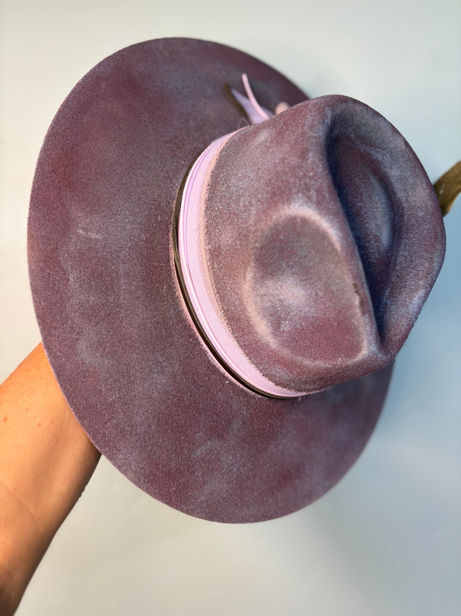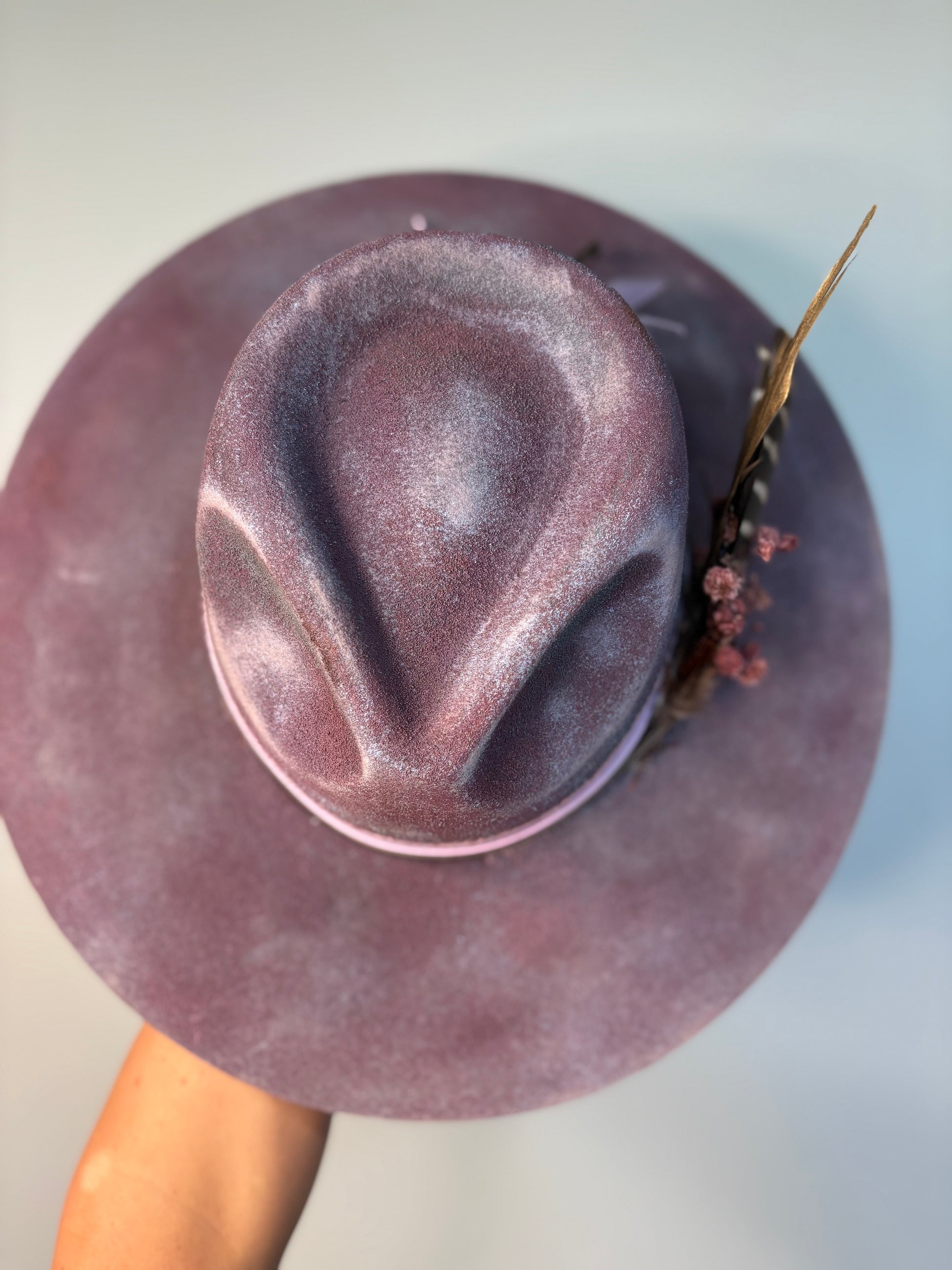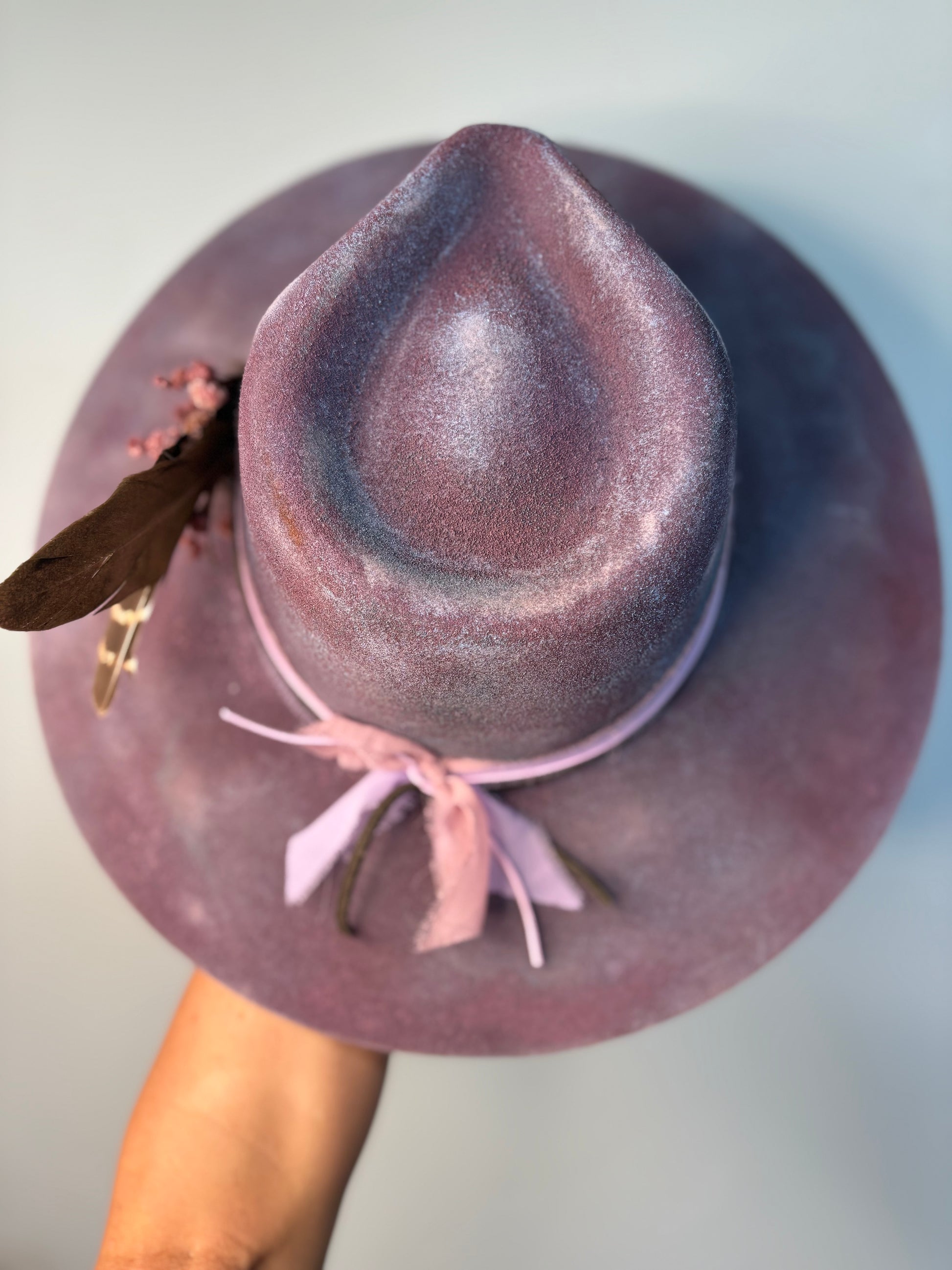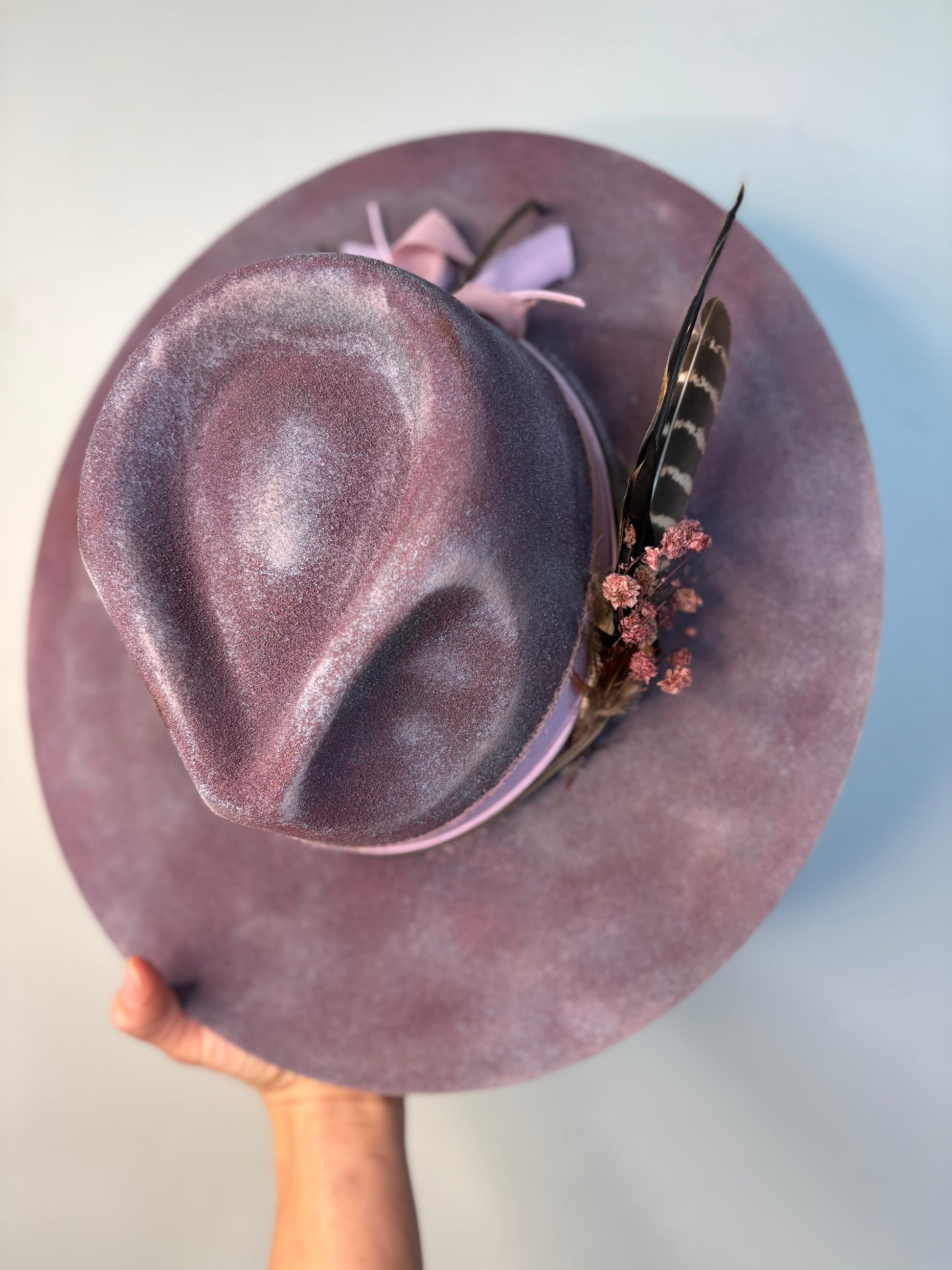 This custom painted hat features a striking blend of purple and pink hues, crafted from 100% wool felt for a soft yet durable feel. A matching purple-pink ribbon band and a delicate flower bundle accentuate its artistic design, adding charm and sophistication. With adjustable sizing, this hat offers a comfortable, tailored fit while making a bold, colorful statement.